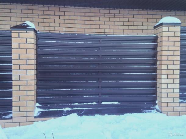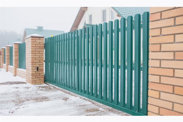 Процесс установки забора из евроштакетника на готовые кирпичные столбы при ограждении частного дома.